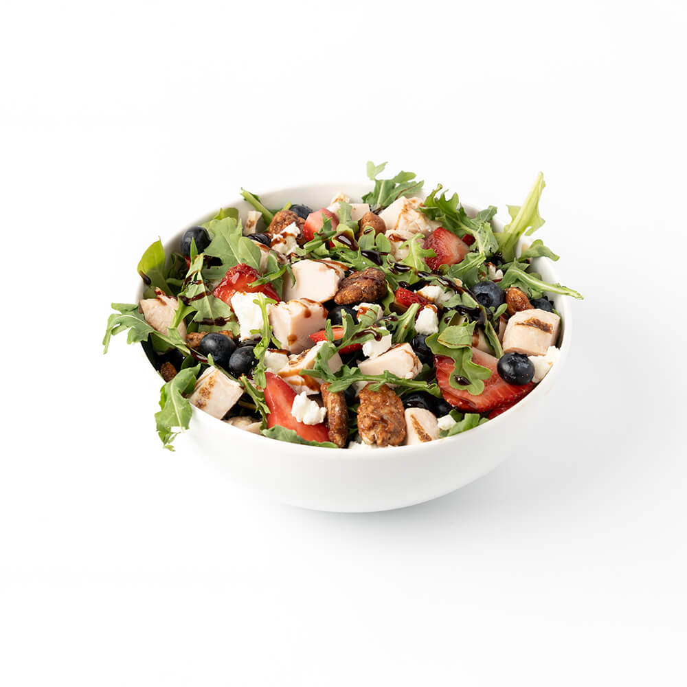 Salade de roquette, poulet grillé, fraises, bleuets, fromage de chèvre, pacanes pralinées et réduction de balsamique