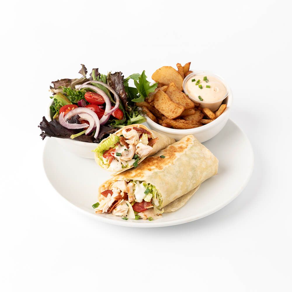 Wrap garni de poulet grillé ou croustillant, laitue romaine, tomates cerises, copeaux de parmesan, bacon, croûtons émiettés, mayo et vinaigrette César, servi avec salade verte et patates